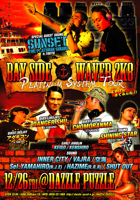 日本のレゲエ界を代表するJUGGLIN SOUND SUNSET the PLATINUM SOUNDがこの度長崎は佐世保に初上陸!! 今回はリニューアルしたばかりのSOUNDSYSTEMを 東京からフルで持ち込んでのDANCEとあって盛り上がりは必至!! しかも九州No.1SOUND CHOMORANMAもGUESTに迎えての豪華な顔ぶれ!!!! 今年最後の華の金曜日、REALなREGGAEと本物の音を体感せよ! 『BAY SIDE WAVER 2K8』 ~PLATINUM SYSTEM TOUR~ 12/26(FRI) @DAZZLE PUZZLE 佐世保 OPEN 22:00 ADM\2500+1D ◆GUESTSOUND◆ SUNSET the PLATINUM SOUND with SOUNDSYSTEM from東京 CHOMORANMA from福岡 SHINING STAR from東京 ◆GUESTARTIST◆ DANGER SHU from福岡 アダチマン from東京 and more... ◆SOUND◆ INNER CITY VAJRA 空海 Sel.YAMAHIRO(N.J.E) HAZIME(R.R.R) SHUT OUT ◆EARLY JUGGLIN◆ KEIGO KENSHIRO Dazzle Puzzle(ダズル・パズル) 〒857-0863 長崎県佐世保市三浦町4-33-2F TEL 0956-23-1069 http://dazzle-puzzle.jp/ info:shintaman999@yahoo.co.jp (SHUT OUT SOUND KENNY) 【AUTOMATIC riddim】