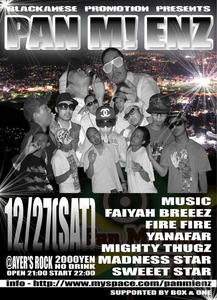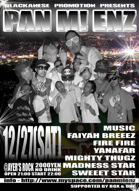昨夜はSHUT OUT SOUNDあざしたー! 楽しい夜でした! 写真見つけたら詳細upしますね(多分)。 んで 今夜はパンミに遊びに行く予定! 爆発しそうだなー! とりあえず寝てないのと風邪で死にそうなので 泥のように寝て体力回復させときます。 では後で! ...zZZ。 PAN M! ENZ 2K8 SPECIAL!!! 12/27(SAT) ※我らが九州男くん,長崎凱旋ライブ(長崎市公会堂)の夜です!! @AYER'S ROCK(長崎) 長崎県長崎市万屋町6-13 花の木ビルB1F OPEN 21:00 START 22:00 ADM:2000YEN(NO DRINK) MUSIC FAIYAH BREEEZ FIRE FIRE YANAFAR MIGHTY THUGZ MADNESS STAR SWEEET STAR FLOOR SOUTH CLUB and more (SPECIAL GUEST) 早くからご来場の方には,MIX CD(DANCEHALL/CLASSIC/R&B...)プレゼント!!! そして,当日は,いつもサポートしてくれているBOX & ONE特製【炎組とのコラボレートTシャツ(白・ピンク・黒):3500円】の販売もあります!!! 【R.I.P dancer ICE the creator of the "Gully Creepa" 】 【MAVADO VS KARTEL】