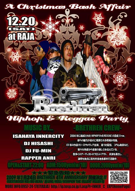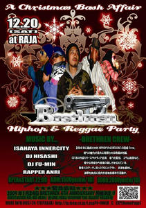 BRETHREN 2008FINAL!! 12月20日土曜日です! 今年最後のブレジンなんで 忘年会気分でガヤガヤと ジャパニーズクリスマス直前なんで 浮かれ気分でダガダガと ワッショイワッショイで ワイワイと楽しみましょう!! カラーコードは クリスマス直前なんで 赤、緑、白を入れてお洒落して来てもらうと 特典無いですが素敵です。 (もちろんそうじゃなくても入場可ですよ) プレゼント配布の準備中やけど遊びに来たよという サンタやトナカイの方には 鼻が赤くなるまで お酒ご馳走しますので。 まぁなんというか みんなで 踊って歌って 楽しみましょう!! 1.24BRETHRN4周年のチケットも数枚持っていくんで欲しい方は声かけてくださいね。 2008.12/20(土) 【BRETHREN】 atRAJA(諫早) Start22:00 ADV:1500yen(w/1D) Door:2000yen(w/1D) Music by ISAHAYA INNERCITY DJ HISASHI DJ FU-MIN RAPPER ANRI MORE INFO 0957241787(RAJA) http://ip.tosp.co.jp/i.asp?I=INNER_C_EXP(HP) 満員御礼!! 2008年最後のBRETHRENは 12/20(第三土曜日)RAJAにて開催です!! 年末締めくくりの12月、 全員ガッチリ盛り上がっていきましょう! 今回は 1/24のBRETHREN四周年PARTYを前に (guest:BOXER KID/BIG BEAR/SCORPION THE SILLENT KILLER/卍LINE/REILI/他) 私達BRETHRENが魅せようとしている世界観を もう一度体感してもらおうと思い あえてGUESTを呼びませんでした! つまり 『100%BRETHREN WORLD』な一夜です!!!! GUESTを立てず創れる分、 より明確に選曲、流れ、空間等が表現されていきます。 是非 BRETHRENが何か、何処を目指しているのかを感じとってください!! 誰もが上がるフロアライクな名曲、定番から新譜、隠れた一曲まで 四周年を控えたBRETHREN CREWが最高の夜を演出します。 つまりは..... 楽もーだい!! 【ARAB MONEY /BUSTA RHYMES】 コレは超簡単なんでみんなで踊りましょうw 前売欲しい方ご連絡下さい!